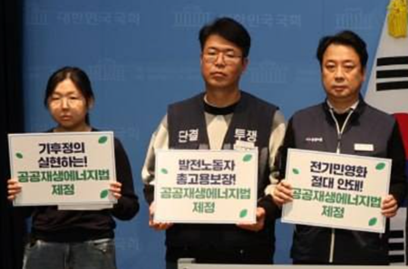 정의로운 에너지 전환과 전력 공공성 강화를 목표로 한 ‘공공재생에너지법’이 16일 국회에서 발의됐다. 민주노총 공공운수노조와 발전노조, 한국노총 공공노련과 전력연맹 등과 법안을 대표발의 한 박해철 더불어민주당 의원 등은 이날 국회 소통관에서 기자회견을 열고 “기후위기 대응을 민간 중심 ...
