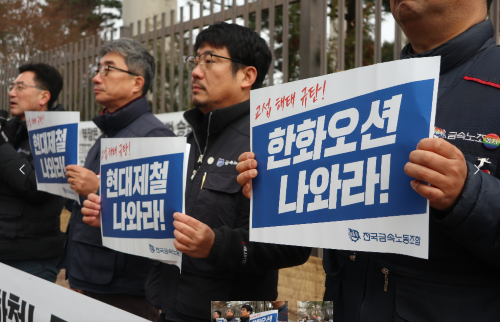 현대제철과 한화오션 하청노동자들이 원청의 교섭 거부에 맞서 쟁의조정 절차에 돌입했다. 전국금속노동조합은 15일 오전 세종시 고용노동부 앞에서 기자회견을 열고 “법원 판결로 원청 사용자성이 확인됐음에도 두 기업이 교섭을 거부하고 있다”며 즉각적인 원청 교섭을 촉구했다.