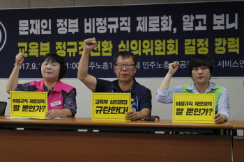 문재인 정부가 학교 비정규직의 정규직 전환을 거부했다. 교육부는 11일 기간제 교원, 영어회화전문강사(영전강), 초등스포츠강사를 정규직 전환 대...