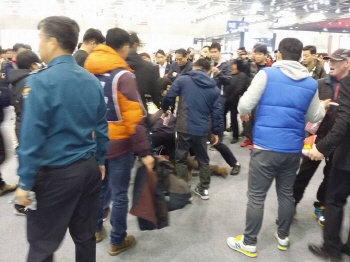 경찰이 서울 모터쇼에서 현대차그룹 정몽구 회장의 구속을 촉구하던 현대기아차 노동자 7명을 연행했다. 연행 과정에서 노동자 1명이 크게 다쳐 병원...