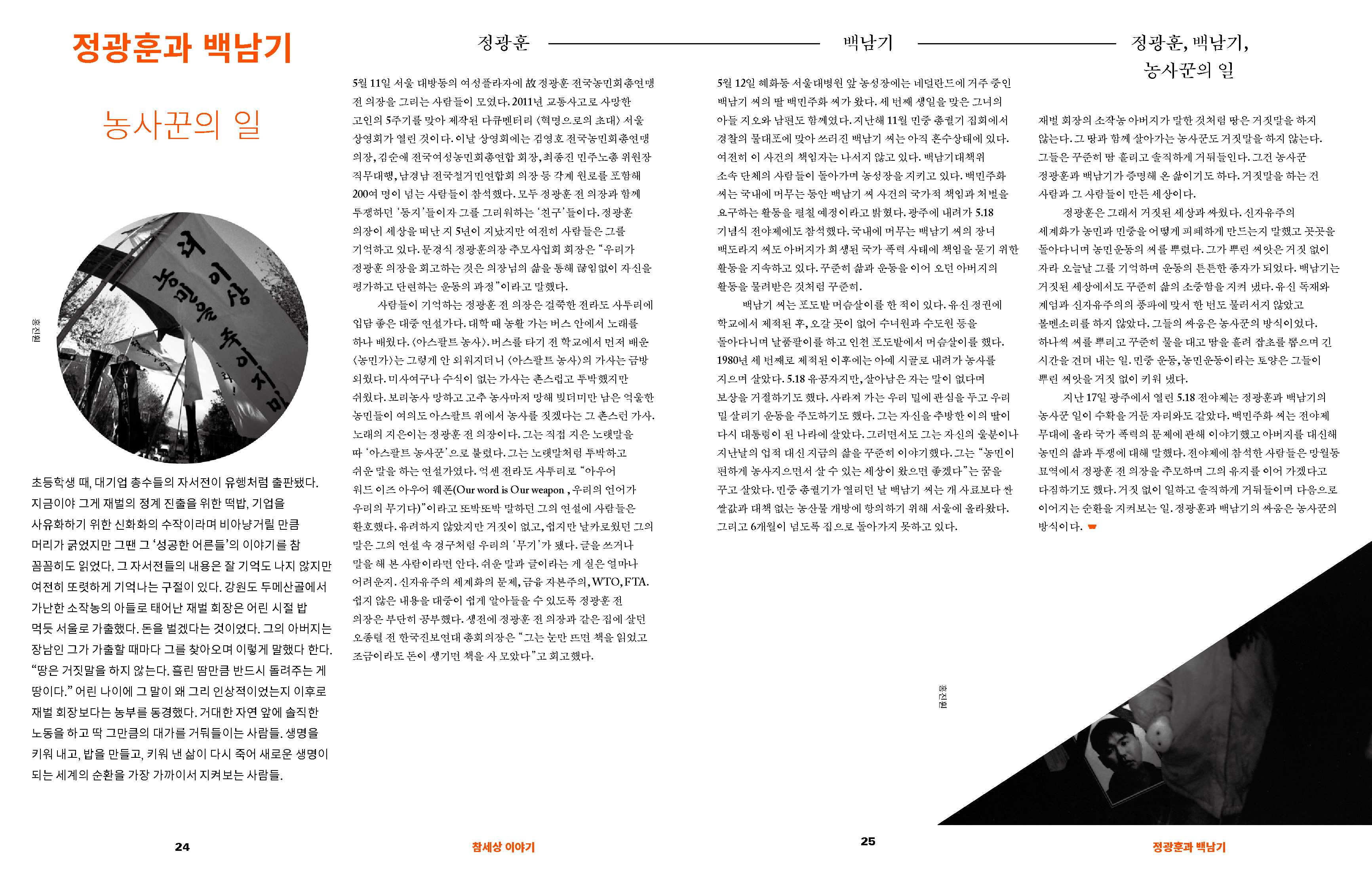 지난 17일 광주에서 열린 5.18 전야제는 정광훈과 백남기의 농사꾼 일이 수확을 거둔 자리와도 같았다. 백민주화 씨는 전야제 무대에 올라 국가...