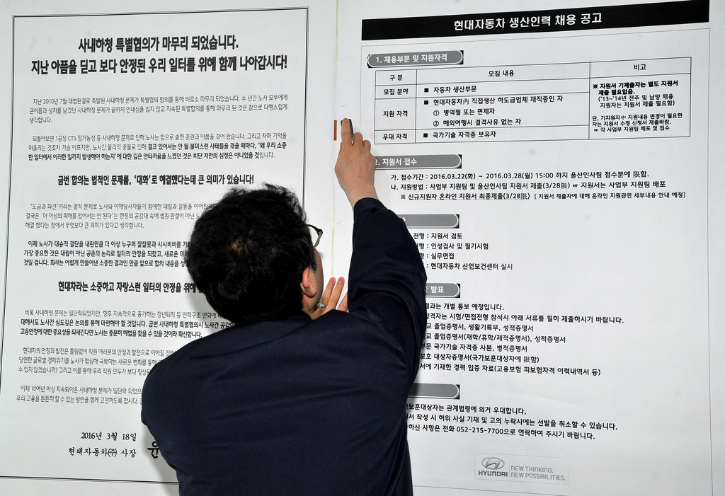 현대차 울산공장 사내하청 노조(비정규직지회)는 17일 조합원 679명을 대상으로 실시한 ‘특별채용 잠정합의안 찬반투표’에서 622명 가운데 48...