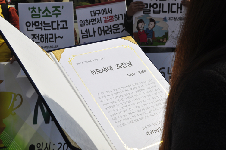 대구청년유니온이 여직원 결혼 퇴직 강요 논란을 일으킨 주류업체 금복주에 ‘N포세대 조장상’을 시상했다.
