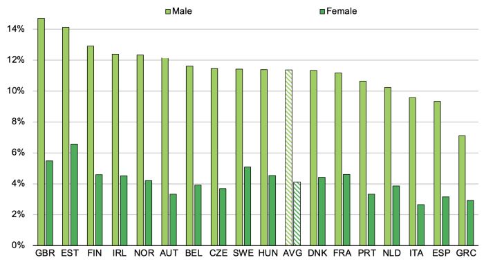 모든 국가에서 여성이 친환경 일자리에 종사할 확률이 낮다(그림 2, 패널 A). 예를 들어, 영국에서는 남성 노동자의 15%가 녹색 일자리에 고용되어 여성 노동자의 비율(6%)보다 두 배 이상 높다. 이는 대부분 환경적 관점에서 중립적인 서비스업, 보건, 교육 등의 서비스업에서 여성이 과도하게 대표되는 것을 반영한다. 반면 남성은 제조업, 건설업, 공공서비스업(친환경 일자리와 고오염 일자리 모두에서 가장 높은 비중을 차지하는 산업)에 과대 대표되고 있다.