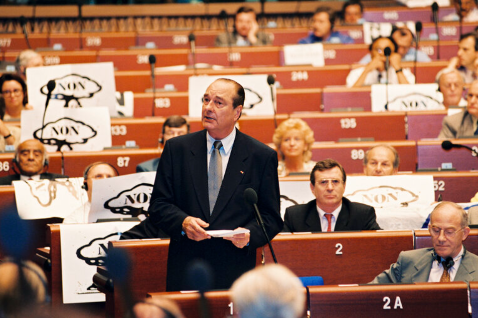 1995년 7월, 자크 시라크(Jacques Chirac) 프랑스 대통령은 스트라스부르(Strasbourg)에 있는 유럽의회를 공식 방문하는 동안, 무루로아(Moruroa)에서 핵실험을 재개하기로 한 프랑스의 결정에 항의하는 시위와 유럽의회 의원들 사이의 강한 반대에 직면했다. 출처: 유럽의회 멀티미디어센터