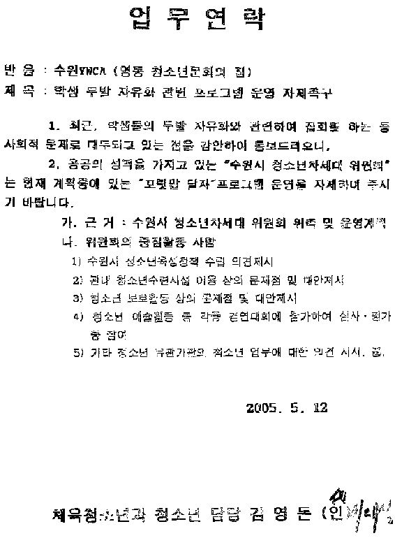 공문은 '수원시 청소년 차세대 위원회 위촉 및 운영계획'을 근거로 '최근 학생들의 두발 자유화와 관련하여 집회를 하는 등 사회적 문제로 대두되고 있는 점을 감안하여 꼬릿말을 달자 프로그램 운영을 자제하는' 업무 연락 내용을 담고 있다.