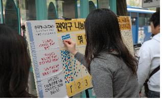 ▲ 나눔캠페인팀에서 길거리스티커 설문조사를 하고, 이 결과를 인터넷에 기사 형태로 올리고, 이 내용으로 관악e세상이라는 프로그램에 리포터 형태로 참여한다. 관악하모니 역시 이러한 형태를 통해 이뤄지며, 설문조사한 것은 또 거리 전시를 통해 공유된다. ‘가깝다’라는 점은 이렇게 장점으로 조직운영에 돌아온다. |