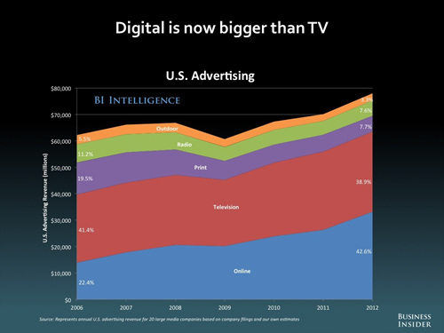 2006년에 인쇄매체와 비슷하고 텔레비전의 절반밖에 되지 않던 온라인 매체 대상 광고비는 불과 6년 만에 시장에서 가장 큰 파이를 차지하게 되었다. 이 말은 사람들의 시선을 붙잡는 건, 적어도 구매 능력이 있는 계층에 한해서는 온라인이 시장의 선두 자리를 넘겨받았다는 걸 알려주는 가장 명확한 사례다.