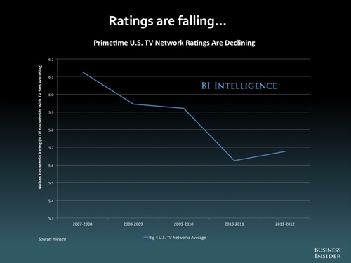 사람들은 여전히 텔레비전을 본다. 하지만 시청 습관이 달라졌다. 주요 시청 시간대의 시청률은 떨어지고 있지만 주문형 비디오 공급자인 넷플릭스와 훌루, 아마존의 이용률은 매년 증가하고 있다. 이 업체들은 텔레비전뿐만 아니라 컴퓨터나 모바일용 서비스도 동시에 제공하고 있는데, 이를 감안하면 사람들은 텔레비전 ‘방송’을 볼 뿐 더 이상 ‘텔레비전’ 방송에 얽매이지 않는다는 것도 짐작해볼 수 있다.