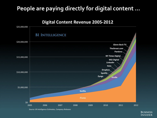 P2P, 웹하드, 토런트 같은 무료 공급처가 있음에도 불구하고 미국의 소비자들은 2012년에만 2백억 달러 이상의 돈을 지불했다. 특히 애플에서 운영하는 아이튠즈 스토어의 비중은 거의 절대적으로 시장의 절반 이상을 점유하고 있음을 알 수 있다. 애플 제품의 시장 점유율은 갈수록 줄어들고 있는 데 비해 이익은 늘어나는 이 기이한 현상의 비결은 무엇일까. 그것은 음악, 비디오, 책, 게임 등의 다양한 콘텐츠 공급자들과 손을 잡고 몇 번의 터치만으로 원하는 상품을 구매할 수 있게 만든 생태계 때문이 아닐까 생각한다. 다시 말해 소비자들은 쉽고 편리하게 콘텐츠만 제공해 준다면 얼마든지 지갑을 열 준비가 되어 있는 것이다.