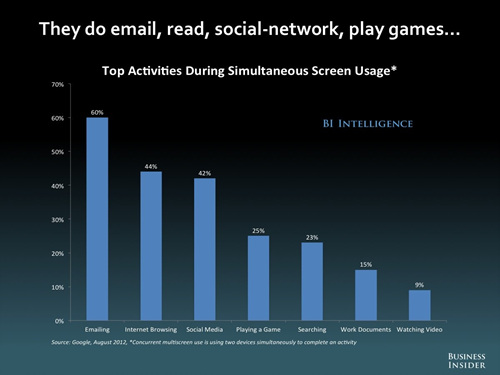 멀티태스킹의 일반화도 주목할 만한 부분이다. 어떤 일을 하며 동시에 다른 일까지 하는 것이 멀티태스킹인데 과거에는 음악이나 라디오를 들으며 공부와 일을 하는 수준이었다면, 요즘에는 텔레비전이나 컴퓨터로 방송이나 비디오를 보면서 스마트폰이나 태블릿PC와 같은 모바일 기기로 다른 사람들과 연락을 하거나 뉴스와 정보 검색을 하는 등 동시에 여러 가지 일을 자연스럽게 하고 있다.