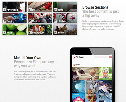 아이패드가 처음 나왔을 때 주목받았고 여전히 많은 사용자가 이용 중인 앱 중에 플립보드(Flipboard)라는 앱이 있다. 이전까지 트위터, 페이스북, 뉴스, 기타 RSS 소식들을 보려면 일일이 해당 서비스 앱을 설치해야 했다. 간혹 통합 SNS앱이 등장하긴 했지만 사용자 인터페이스가 불편했다. 문자 위주의 타임라인이기 때문에 연결된 자료나 사진, 영상 등은 일일이 눌러야 확인할 수 있었다. 그런데 플립보드는 사용자가 구독하는 SNS 자료들을 한 번 등록만 하면 자동으로 플립보드 앱 안으로 가져왔고, 이질적인 자료들을 원래 하나의 자료였던 것처럼 미려하게 화면 위로 뿌려줬다. 특히 실제 잡지를 보는 듯 한 인터페이스와 디자인은 첨단 기술에 익숙하지 않은 이들조차 거부감 없이 사용할 수 있게 도와주었다. 나중에는 자신이 직접 만든 ‘매거진’을 타인과 공유할 수 있게 되었는데, 이야말로 소통의 시대의 최고의 가치가 아닐까.