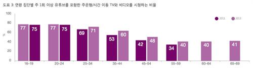 흥미로운 것은 주문형 비디오 시청 비율의 연령별 추세인데, 첨단 기기에 친숙한 10대와 20대의 비율이 미세하게 감소하는 반면, 30대 이상의 전 연령대에서는 뚜렷한 증가 추세를 보이고 있다. 이는 저렴한 스마트폰의 보급과 가정용 TV 콘텐츠 공급 방식이 기존의 아날로그 방식에서 IPTV 방식으로 전환되고 있는 결과가 아닐까 추론해볼 수 있다. 물론 상대적으로 기술에 취약한 세대를 위한 쉬운 접근방식과 인터페이스, 간단해진 유료결제 방식의 역할도 컸으리라 짐작해본다.