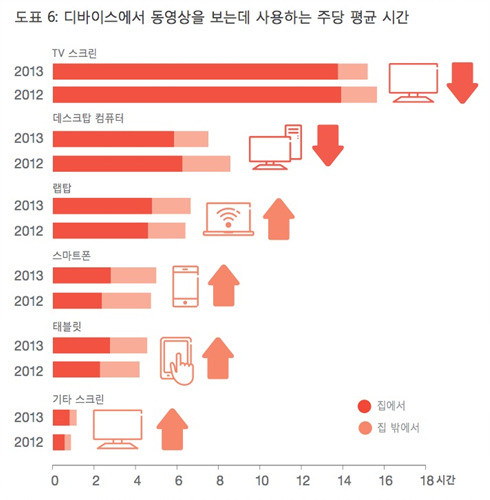 도표에서 확인할 수 있듯, TV나 컴퓨터 같은 붙박이 화면 앞에 앉아 동영상을 보기 보단 랩탑, 스마트폰, 태블릿 등의 모바일 기기로 ‘움직이면서’ 감상하는 유목민적 삶이 대세가 되고 있다는 것을 알 수 있다. 특히 모바일 기기의 사용 시간은 텔레비전 사용 시간과 거의 동일하거나 넘어서는 추세인데, 이는 단지 움직이면서 보는 방식의 변화 정도가 아니라 이동 중에 잠깐씩 봐도 되는 짧은 영상이나 인터넷 기반 영상들이 부상하고 있다는 의미이기도 하다.