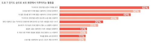 > 75%는 TV를 시청하면서 모바일 기기를 사용하는 등 여러가지 활동을 동시에 수행한다. 4명 중 1명은 동시에 여러 개의 비디오를 시청한다.