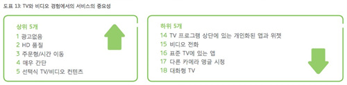 다양한 방식으로 방송과 비디오 서비스를 소비하는 사람들은 자신들이 누리는 서비스에서 어떤것을 중요하게 생각할까. 중요도가 높게 나온 상위 5개의 요소들은 ‘광고 없음’, ‘HD품질’, ‘주문형/시간 이동’, ‘매우 간단’, ‘선택식 TV/비디오 콘텐츠’인데 한 줄로 요약하자면 ‘내가 원하는 걸 편하게’ 정도가 될 것이다. 과거에 몇 안 되는 공중파 방송국에서 주는 대로 시청했던 것과는 사뭇 다른 ‘주체적인 소비자’의 특성이 확실히 드러나고 있다. 반면 하위 5개의 요소들을 보면 첨단 제품 제조사들이 발표회와 광고에서 열심히 떠드는 많은 기능들이 아직까지는 현실과 괴리되거나 불필요한 뽐내기에 그친다는 것도 확인할 수 있다. 혹은 아직까지도 시청자들은 선형적인 시청방식에 익숙한 나머지 이야기 몰입을 방해하거나 비디오 시청에서까지 컴퓨터와 같은 비선형방식의 기기 사용은 원하지 않는다는 방증일 수도 있다.