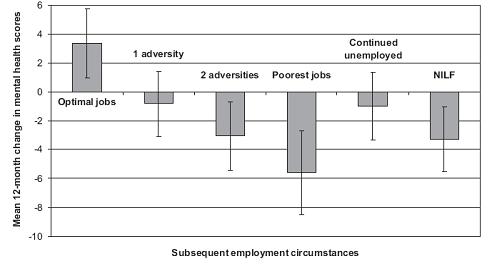 - 세로축 : 12개월간의 정신건강 점수의 변화 - 가로축 : 고용 상태의 변화 - 직업의 심리사회적 질은 높은 직무요구도 및 업무복잡성, 낮은 직무 재량권, 고용불안, 부적절한 임금의 4가지 요소 중 문제가 되는 요소의 숫자로 구분함 Optimal jobs : 해당되는 문제 항목 없음 1 adversity : 문제가 되는 심리사회적 요소가 1개 2 adversity : 문제가 되는 심리사회적 요소가 2개 Poorest jobs : 문제가 되는 심리사회적 요소가 3개이상 Contiuned unemployed : 지속적인 실업상태인 경우 NILF : 구직활동없이 경제활동 종사하지 않음
