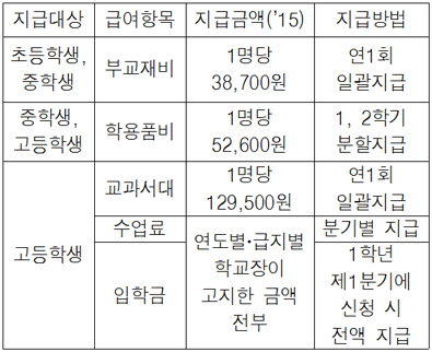 ▲ <표 3> 2015년 교육급여 지급기준 및 지원내역 |