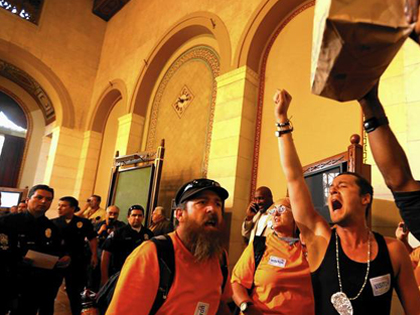 ▲ LA 커뮤니티 행동 네트워크의 홈리스 옹호 그룹의 구성원들이 시의회의 홈리스 캠프 단속 승인에 항의하고 있다. [출처: LA 타임즈] |