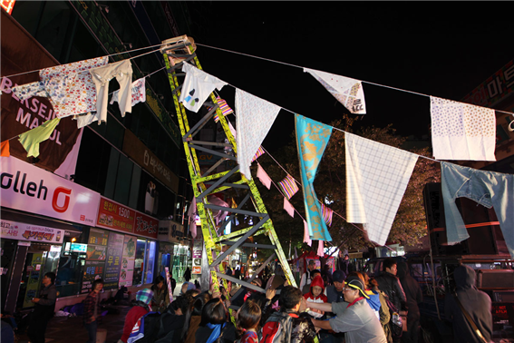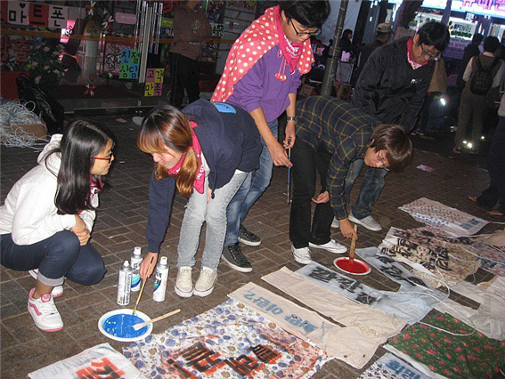 10월 8일 5차 희망버스는 다시 부산으로 달렸다. 경찰의 대응 강도는 더 심해졌다. 일반버스 승객들의 영도 진출을 막기 위해 신분증 검사를 하며 참가자를 색출하는가 하면 도로 행진하던 시민들을 무작위로 연행해 가기도 하고 수시로 최루액과 물대포를 발사하며 위협했다. 심지어 고속도로 톨게이트에서 희망버스를 막고 부산으로 들어갈 수 없다며 통행 자체를 봉쇄하기도 했다. 부산역으로 가는 길은 험난했고 우린 집결지를 남포동 BIFF광장으로 정하고 그곳에서 문화제를 진행하기로 했다. 마침 부산국제영화제 행사로 많은 사람이 이 광장에 있었고 영화인선언에 참가한 1,543명이 희망버스에 함께하기로 했기에 결정한 장소였다. 영화인들은 외쳤다. “김진숙 그녀와 영화를 보고 싶습니다.” 남포동 BIFF광장의 밤은 또다시 신나는 난장의 밤이 됐다.
