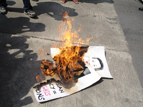 ▲ 방콕 노동자들은 노무현 대통령의 사진을 태우며 한국정부를 강력히 규탄했다. [출처: 민주노총] |