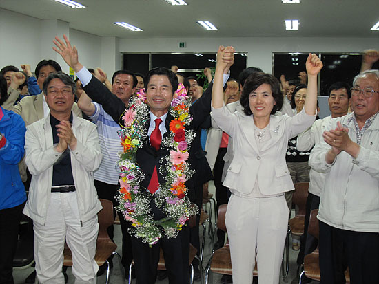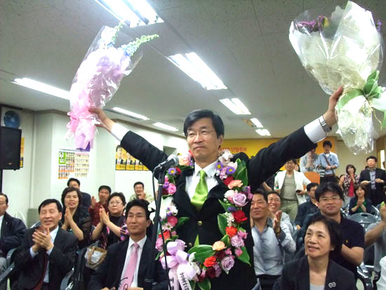 ▲ 장만채 후보가 전남교육감 당선이 확실시되자 지지자들의 환호에 답하고 있다. [출처: 교육희망] |