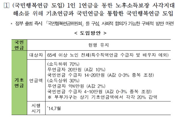 국민연금에 가입하지 않은 소득하위 70% 노인들에게는 20만원을 지급하고, 국민연금을 받고 있는 소득하위 70% 노인들은 14만원~20만원의 연금을 차등 지급한다.