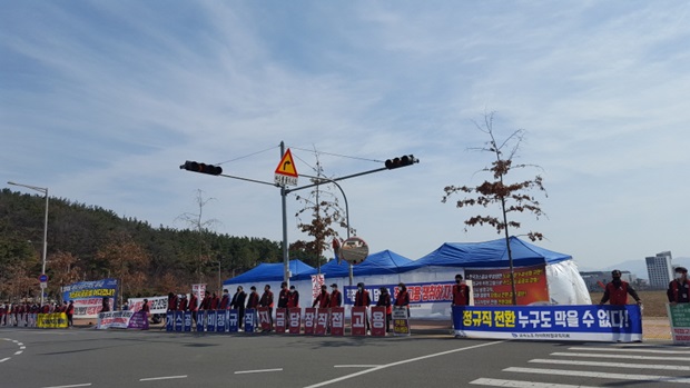 2월 21일 오전, 대구광역시 동구 혁신도시 한국가스공사 본사 앞. 붉은 조끼를 입은 한국가스공사 비정규직 노동자들(공공운수노동조합 한국가스공사 비정규지부)이 15일 차 파업 출정식을 하고 있다. 이들은 2월 7일, 정부의 ‘공공부문 비정규직 정규직 전환 가이드라인’에 따른 한국가스공사 전체 비정규직 노동자의 직접고용 전환을 요구하며 무기한 파업에 들어갔다.