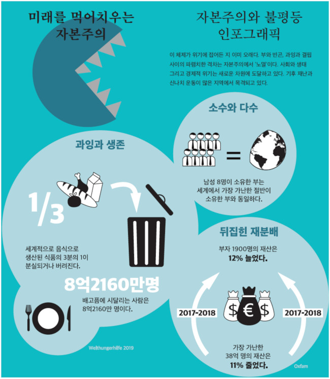 미래 먹어치우는 자본주의 [이슈②] 자본주의와 불평등 인포그래픽 정은희 기자 2020.03.09 09:52 크게 작게 프린트 기사공유 | 이미지 큰 사이즈로 보기(새 창) 이미지 큰 사이즈로 보기(새 창) [출처] 독일 로자룩셈부르크재단 <미래를 위한 사회주의> 인용 및 일부 재구성