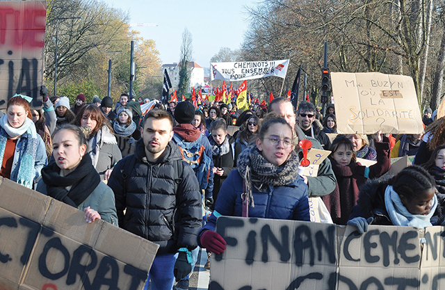 주요 노조연맹 중에서 프랑스노동총동맹(CGT)과 달리 프랑스민주노동연맹(CFDT)은 처음부터 투쟁에 소극적이었다. 진정한 총파업이라기보다는 많은 노동자들이 공공부문 파업을 지원하는 데 머무는 소위 ‘대리 파업(strike by proxy)’의 한계도 드러나고 있다. 파업이 장기화되고 임금을 못 받게 되면서 동력이 줄어들고 있는 것이다. 파업의 핵심 두 축 중 하나였던 파리교통공사(RATP)의 파업은 1월말에 중단됐고, 남아있던 국영철도공사(SNCF)의 파업도 참가율이 줄어들고 있다. 파업에 우호적이던 여론도 일상의 불편함이 계속되고, 마크롱의 부분적인 양보와 이간질 속에서 다소 줄어든 게 사실이다.