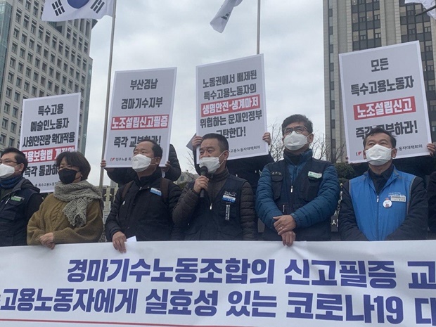 이영철 민주노총 특고대책회의 의장은 “20년간 특수고용노동자들에게 노조할 권리를 요구했다. 법이 바뀌기 전부터 정부와 행정관청은 특고노동자들이 노조 설립 신고를 하면 받아줘야 했다. 그러나 관청이 해야 할 일임에도 하고 있지 않다”고 말했다.