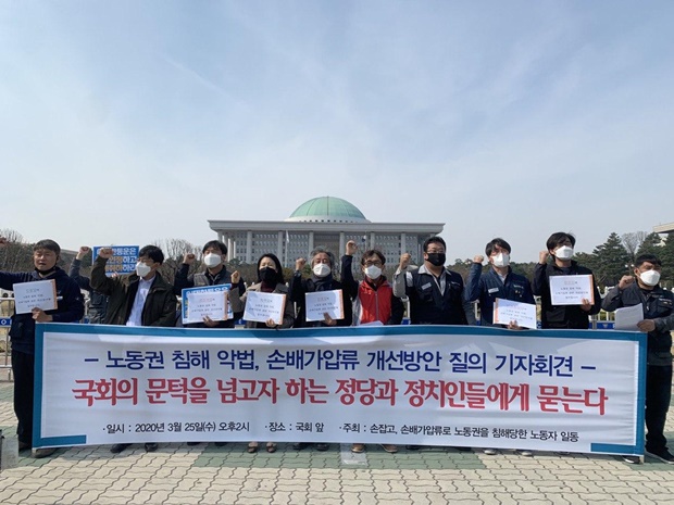 손배가압류를 잡자!손에손을잡고(손잡고)는 25일 오후 2시 국회 앞에서 기자회견을 열고 “헌법을 침해하는 대표적인 악법 노동자 손배가압류를 21대 국회에서도 그대로 두고만 볼 것인가”라며 “21대 국회 입성을 바라는 각 정당은 제대로 답변하라”고 말했다.