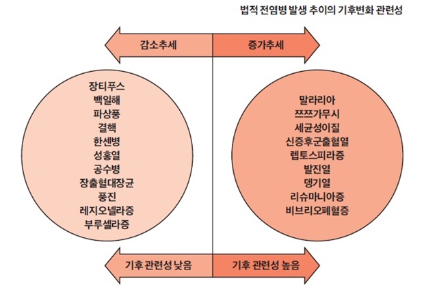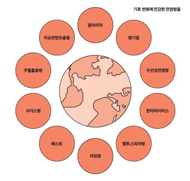 지구의 온도가 상승하면 전염병의 위험은 더욱 높아진다. 세계보건기구(WHO)는 기온 상승 등의 기후변화가 질병을 매개로 하는 동물 분포의 변화를 가져와 인류 건강에 영향을 미칠 것이라 경고했다. 국내외 학자들도 기온 상승으로 인한 전염병 확산을 우려해 왔다. 기온 상승이나 대기환경의 변화로 바이러스 매개 동물의 수명이 연장되거나, 품종이 변화되거나, 성장속도가 빨라진다는 것이다. 이들에 따르면 최근 신종 인수공통전염병3이 세계적으로 발생하고 있으며, 신종 전염병의 75% 이상이 동물에서 유래했다.4