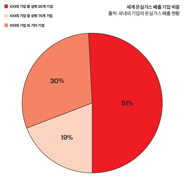 온실가스 중 인간 활동에 의해 가장 많이 배출되는 물질은 바로 이산화탄소다. 이산화탄소는 에너지 사용을 비롯해 석탄, 석유 같은 화석연료를 연소하는 과정 등을 통해 발생한다. 세계 이산화탄소 배출량의 46%는 석탄, 34%는 석유, 19%는 가스사용에 의한 것이다. 석유와 석탄의 비중이 높아진 것은 그리 오래된 일이 아니다. 2000년대 초반까지만 해도 세계 이산화탄소 배출량의 석유, 석탄 비중은 40%가량이었다.7 그리고 다량의 온실가스를 배출하며 기후위기를 촉발하는 주범은 세계적 자본들이다. 1988년부터 2015년까지, 전 세계 온실가스 배출량의 51.3%를 차지한 이들은 세계 상위 25개 기업이었다. 100대 기업으로 넓힐 경우, 이들이 배출하는 온실가스는 전체의 70.6%에 달한다. 자본주의 이후, 소수의 자본이 기후 위기를 급격히 촉발시켜 온 셈이다. 국내 상황도 다르지 않다. 2017년 기준, 온실가스 배출 상위 10%에 해당하는 사업장이 국내 배출량의 87.2%를 차지하고 있다.8