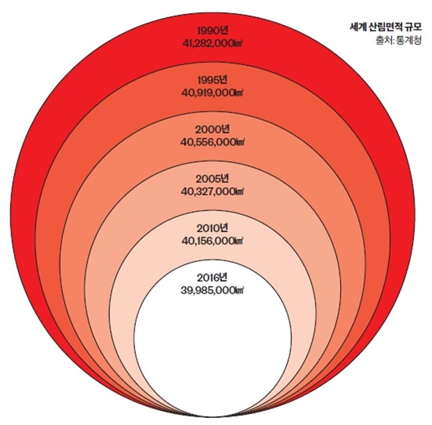 산림 파괴는 기후위기를 촉발하기도 한다. 산림청에 따르면, 세계 온실가스 배출량의 17.4%가 산림 파괴에서 비롯된다. 산림은 기후와 불가분의 관계다. 산림은 공기 중의 온실가스, 주로 이산화탄소를 흡수하고 산소를 배출하는 역할을 한다. 산림이 사라지면 공기 중의 이산화탄소가 흡수되지 못한다. 이산화탄소를 비롯한 메탄, 이산화질소 등 온실가스는 지구의 온도를 상승시키는 주범이다. 태양 복사에너지의 30%가 온실가스 층에 가로막혀 다시 대기로 돌아오기 때문이다.