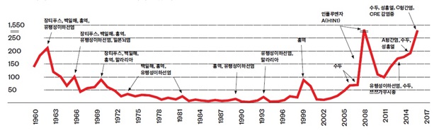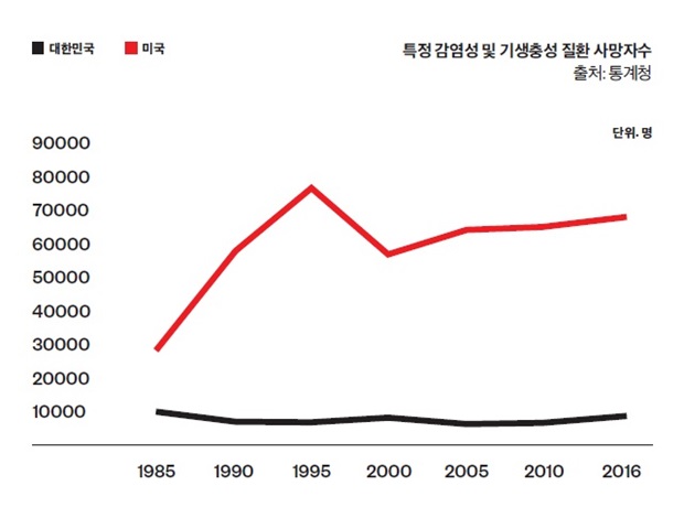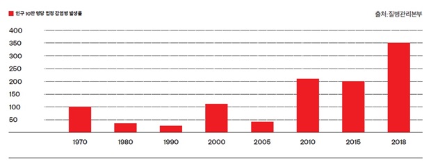 의료산업과 의료기술이 발전해도, 감염병으로 인한 사망률은 줄어들지 않는다. 대한민국의 감염병 사망자 수는 1986년 7382명에서 2016년 7946명으로 오히려 늘었다. 미국도 다르지 않다. 1986년 미국에서 감염병으로 사망한 사람은 3만 1623명이며, 2016년에는 7만 52명으로 두배 이상이 늘었다. 특히 최근 20년간의 지구의 기온 상승으로, 아열대지역에서 주로 전파되던 인수공통전염병이 전 세계적 매개성 전염병으로 급속히 확대되고 있다. 한국 질병관리본부에 따르면, 국내 말라리아 환자는 1990년에 6명에서 2006년 2051명으로 급격하게 증가했다. 한국은 OECD국가 중 말라리아 발생률 1위를 기록하고 있다. 뎅기열 환자도 2001년 6명에서 2006년 35명으로 늘었다. 쯔쯔가무시증은 1994년 첫 환자가 발생한 이후 2007년 6480명으로 확산됐다.6 인구 10만 명당 법정 감염병 발생률은 1980년 21.5명에서 2018년 329.1명으로 15배가 늘었다.