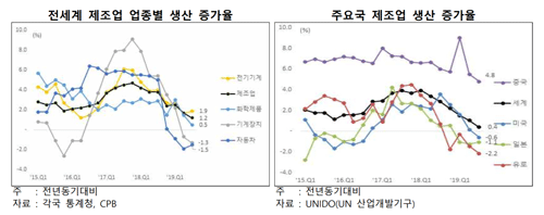 글로벌 공급과잉의 심화는 공급능력의 향상에 따른 국가간, 자본간 경쟁의 격화로 나타났고, 이는 설비가동률의 상승 후 하락과 생산의 둔화로 확인된다. 전 세계 제조업의 생산 증가율은 2017년 4분기 이후 하락세를 지속하고 있으며, 특히 자동차, 기계장치 등 전통 제조업의 생산 증가율이 큰 폭으로 하락했다. 국가별로 보면 미국, 유로존, 일본, 중국 등 주요국 모두 제조업 생산이 둔화세를 기록했다. 가격경쟁이 치열해지면서 각국의 무역구제조사도 확대됐고, 미중간의 무역분쟁도 이 배경 하에서 벌어졌다.