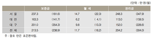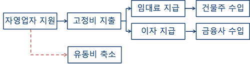 한국노동연구원의 자영업자 경영실태(2019.6)을 보면, 임차건물이 전체의 89.4%로 가장 컸고, 본인 소유는 10%, 무상은 0.7%를 차지했다. 자영업자의 90%가 임대료를 지불하면서 영업을 하고 있다. 자영업자 사업체 건물의 연면적은 평균 17.2평이며 매월 평균 201만원(평당 11.7만원)을 월세로 지급한다. 전체 영업비용 중 재료구입비 61.8%, 인건비가 23.8%를 차지하고 그 다음으로 임대료는 7.4%에 불과하다. 그러나 재료구입비 등은 영업상황에 따라 변동하는 유동비용임에 반대 임대료는 고정비로 사업수입과는 무관하게 지출되어야 한다. 임대료보다 적은 수입을 올리더라도 빚을 내서 지급하거나, 아니면 폐업을 해야 한다. 따라서 영세자영업의 경우 수익악화가 지속되는 상황에서 대출이든, 현금지원이든 정부의 지원(금)은 일차적으로 임대료와 이자 지급비용으로 지출된다.