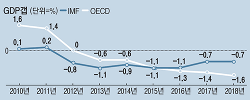 1) 실제 GDP에서 잠재 GDP(한국 경제가 인플레이션을 유발하지 않고 달성할 수 있는 최대한의 GDP)를 뺀 ‘GDP 갭’을 잠재 GDP로 나누면 ‘GDP 갭률’을 구할 수 있다. 과잉자본스톡은 GDP 갭률과 순자본스톡의 곱으로 추산할 수 있다. 여기서 마이너스 GDP 갭률 폭이 확대되면서 과잉자본스톡 규모도 점차 증가하고 있는 것으로 추정된다.