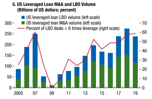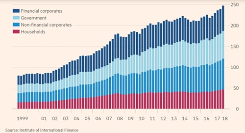 글로벌 부채는 2019년 상반기 기준으로 250조 달러(29경6,500조 원)를 돌파했다.2) 전세계 GDP의 3배가 넘는 규모다. 저성장과 저금리가 맞물려 ‘성장 없이 빚만 불어나는’ 상황이 빚어지면서 경제 다방면에서 부채발 위기 우려를 키워왔다. 기업부채는 심각한 위험수준에 도달했는데, 2007년의 4조9000억 달러와 비교하면 2배가 넘는 10조 달러에 달한다. 국제신용평가사 S&P의 추산에 따르면 투자자들이 정크본드(열등채)에 쏟아 부은 자금은 총 4조 달러에 육박하고 이 가운데 미국 기업들이 빌린 돈의 규모만 해도 2조5000억 달러에 달한다. 특히 레버리지 론(leveraged loan, 부채가 많은 투기등급 기업들이 회사 자산을 담보로 추가로 돈을 빌리는 것)이 급증했는데, 2008년 당시 미국 레버리지론 시장 규모는 7000억 달러 수준이었지만 최근에 1조1000억 달러 규모로 늘었다.