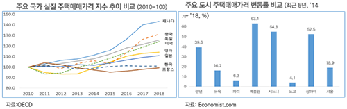 글로벌 금융위기 이후 2010년부터 2018년까지 실질 주택매매가격 변동률을 살펴보면 캐나다는 43.2%나 올랐고 중국(31.2%), 미국(24.3%), 독일(25.7%), 영국(14%) 등이 상승했다. 특히 대도시 중심으로 집값 상승폭이 컸는데, 2014∼2018년까지 5년간 더블린(78.5%), 베를린(63.1%), 벤쿠버(60.4%), 오클랜드(56.4%), 시드니(54.8%), 암스테르담(54.4%), 상하이(52.5%), 샌프란시스코(49.1%), 홍콩(48%), 코펜하겐(45.1%), 스톡홀름(41%), 런던(39.6%), 등 세계 주요 도시에서 집값이 큰 폭으로 상승했다. 4)