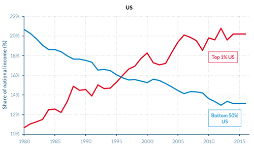 ▲ 미국 국민소득 중 소득 상위 1%와 하위 50%가 차지하는 비중 [출처: World Inequality Report 2018] |