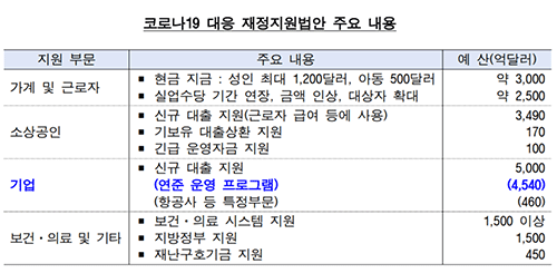 위에서 살펴본대로 이번 경제위기 대응도 지난 2008년 경제위기 대응에서의 문제가 그대로 반복되고 있다. 이는 미국 정부의 재정지원책에 성격에서 그대로 드러난다. 미국 가계와 노동자들(성인)에 대한 지원은 최대 1200달러(150만 원)의 현금지원책과 실업수당 지원 등 5,500억 달러다. 가장 많은 피해를 입고 있고 지원 대상도 많은 소상공인에 대한 지원은 3,660억 달러에 불과하다. 반면, 기업지원은 연준의 운영프로그램을 포함해 1조 달러(1200조 원)에 달한다. 그런데, 실제 연준이 운영할 수 있는 규모는 이번에 재무부가 지원하는 4540억 달러가 아니라 그것의 9배에 달하는 4조 달러다. 물론 현재로서는 지원의 최대치이기도 하고 가용 자원으로 제공하는 지원금이다. 그러나 정부가 발표한 재정지원책에서 숫자로 드러나는 지원예산보다 10배 가까이 기업지원을 늘릴 수 있으며, 위기가 심각해지면 이는 언제든 현실로 나타날 수 있다. 재무부가 직접 지원하는 5,460억 달러 외에 연준이 최대 4조 달러까지 지원할 수 있다고 보면 기업지원은 최대 4조 5천억 달러에 달하고, 미국 전체 가계와 노동자에 대한 지원의 9배에 가깝다.