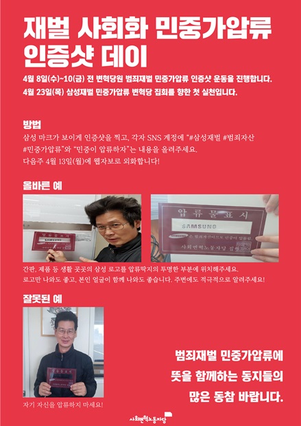 코로나사태의 한복판인 4월 23일 19시, 사회변혁노동자당은 삼성재벌본관 앞에서 민중가압류운동 선포집회로 본격적인 운동을 시작합니다. 이어 민중공동행동과 5월 말 6월 초 전국 각 지역별 재벌체제청산 대행진으로 나아갈 계획입니다. 이 운동은 또 다른 범죄재벌인 현대차, SK, 롯데재벌로 확대돼 나갈 것입니다.