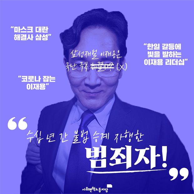 이처럼 수많은 노동자들과 시민들의 피땀으로 이루어진 삼성재벌이 범죄재벌일 수는 없습니다. 그런데 삼성재벌은 범죄재벌로 각인되고 있습니다. 도대체 그 비극은 어디에서 시작되었습니까? 결코 주인일 수 없는 자들이 주인노릇을 하려다 생긴 비극입니다. 주인이 아닌 자들이 주인노릇을 하려면 범죄를 저지를 수밖에 없습니다. 이병철부터 이재용까지 3대에 걸친 총수일족 세습 과정에서 저질러진 온갖 범죄는 2016년 국정농단 촛불항쟁을 통해 낱낱이 드러났습니다. 이재용 일족은 이들의 지분을 불법으로 늘리기 위해 삼성재벌 산하의 기업들까지 범죄의 도구로 이용했습니다.