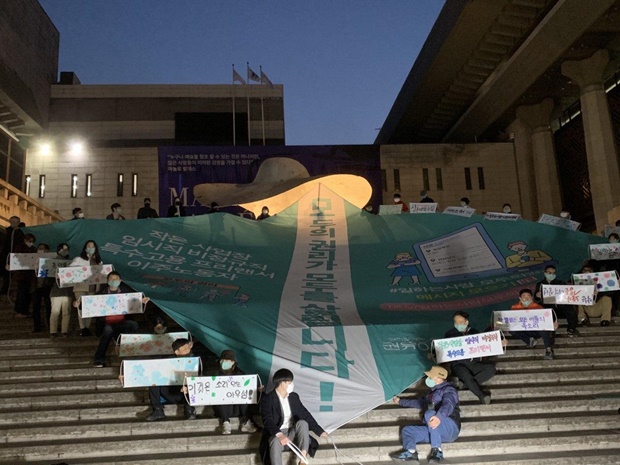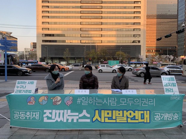 코로나19로 인한 무급휴직 및 해고 사태가 계속되는 가운데, 5인 미만 사업장 및 고용보험 미가입자 등 취약 노동자들의 대책이 필요하다는 목소리가 이어지고 있다. ‘권리찾기 유니온 권유하다(권유하다)’는 8일 오후 6시 서울세종문화회관 계단에서 취약노동자 당사자의 상황을 전달하기 위해 ‘일하는 사람 모두의 권리, 진짜뉴스 시민발언대’를 개최하고 페이스북 라이브 방송을 진행했다.