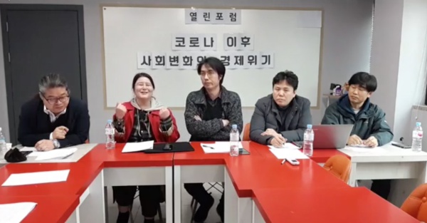 송명관 정책실장은 “전 영국 노동당 당수 코빈이 제안했던 중앙은행의 양적완화가 보건의료 등 공적서비스 분야에 투자되고 필수 공공재에 대한 사회적 인프라 투자, 공공일자리 창출 같은 것들을 이야기해 볼 수 있다”라며 “지금 특수고용노동자들은 석 달 째 급여가 없다. 정말 어려운 사람들의 문제를 수면 위로 끌어올려 대대적 논쟁을 해야 하지 않나 싶다”라고 밝혔다.
