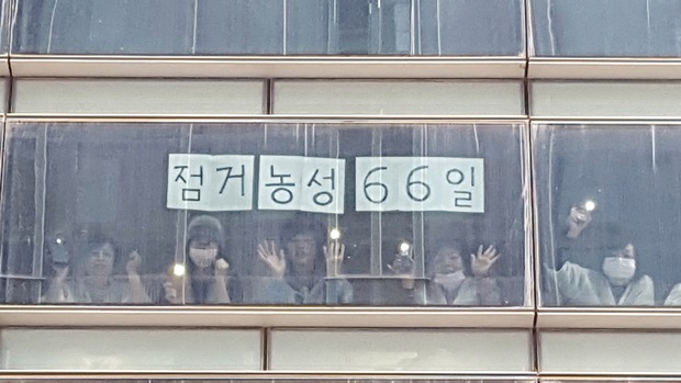 주주총회 일정을 마치고 강남역 삼성생명 앞에 모인 보암모 회원들이 2층 고객프라자에서 소복을 입고 66일 째 농성 중인 암환자들에게 손을 흔들고 하트를 보낸다. 안에서도 휴대폰 불빛과 휴대폰에 ‘투쟁’을 적어 흔들며 하트로 응답한다. 삼성생명은 농성 이후 고객프라자를 폐쇄하고 농성 중인 암환자들이 2층 화장실도 이용하지 못하게 했다. 식사 반입도 제한 해 암환자들이 하루 한 끼를 먹는 단식을 하기도 했었다. 현재 농성 중인 10명의 암환자들은 라면 등 인스턴트 음식을 먹으며 농성을 이어가고 있다. 보암모 회원들은 삼성생명이 보암모 회원들을 일대일로 회유해서 집회에 참여하지 않는 조건으로 합의를 종용하고 있다고 했다.