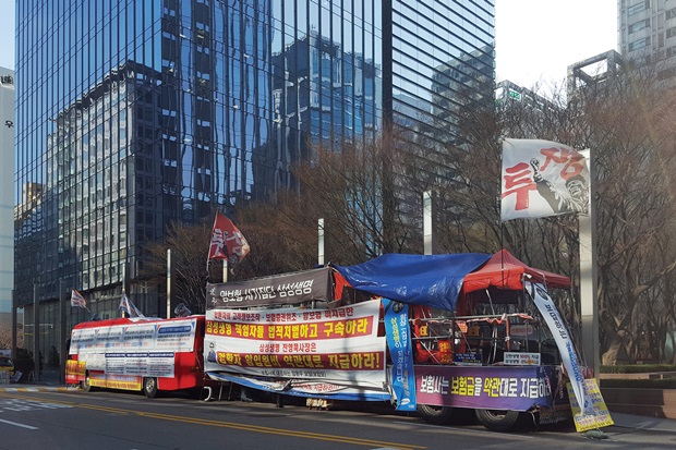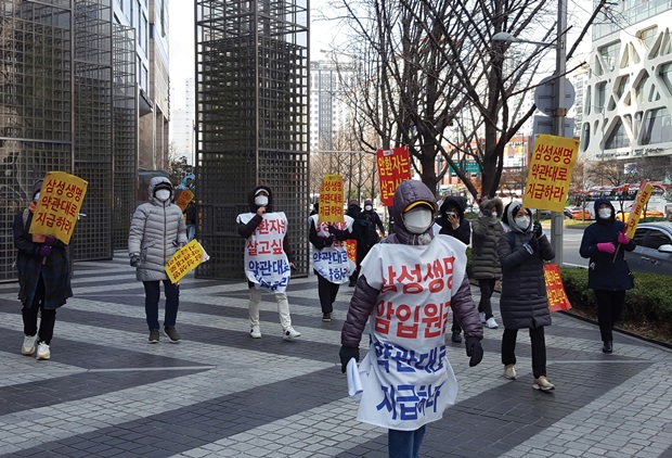 3월 19일 오전 8시 30분, 삼성생명(사장 전영묵) 주주총회 장소인 서울 서초구 서초동 삼성금융캠퍼스 앞. 삼성으로 인해 피해를 입은 해고노동자와 과천 철거민, 삼성생명 보험에 가입한 암환자 등이 ‘삼성 계열사 주주총회 항의 삼성피해자 기자회견’을 시작한다. 태풍급 강풍특보가 내려진 이 날, 참석자들이 현수막을 들고 서있기도 어려울 정도로 바람이 거세다.