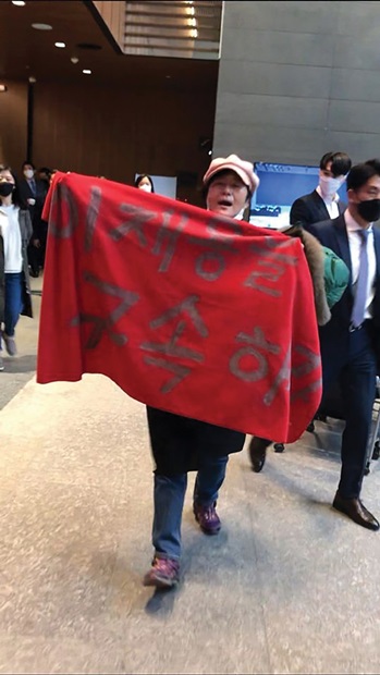 발언을 마친 이정자 씨가 보암모 투쟁을 함께 하고 있는 오세중 전국보험설계사 노조위원장과 함께 주주로서 삼성생명 주주총회에 참석하기 위해 삼성금융캠퍼스 안에 들어갔다. 하지만 삼성생명 직원들이 그들의 입장을 막았다. 두 사람은 밖에서 항의하며 발언권 요청을 했으나 거부당했다. (* 주주총회 내용 ‘삼성피해자 공동투쟁’ 제공 영상 참고)